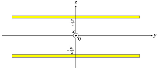 Our investigation was based on Stinson [14] and Allard [15] descriptions of investigative procedures. The Cartesian coordinate system was used, as shown in Figure 7, and through a three-dimensional analysis using the Navier–Stokes equations, the gas equation of state, continuity equation, energy equation, and dissipative function representing the heat transfer, effective density ρs, and compressibility Cs were derived, as shown in Equations (8) and (9), respectively [14]. For several atmospheric properties, including the density (ρ0) of air, λs is the parameter of mediation, bn is the clearance thickness between the two planes, ω is the angular frequency, η is the viscosity of air, κ is the specific heat ratio of air, P0 is the atmospheric pressure, and Npr is the Prandtl number.