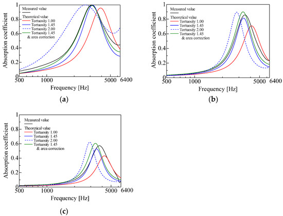 Attention was then drawn to the theoretical values considering the tortuosity. Considering the tortuosity, the peak frequency moved lower in all cases, as shown in Figure 10a–c, and the peak sound absorption value increased in all cases.