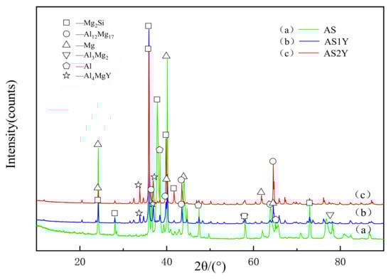 The XRD patterns of the laser-clad Al-12Si coating and the Y2O3-modified coatings are shown in Figure 2. It can be seen that α-Mg and Mg2Si phases have formed in the unmodified coating, and the diffraction peak intensities of these two phases are relatively high. Moreover, they are also accompanied by the production of a certain amount of Al12Mg17 and Al3Mg2 phases. In addition to Mg2Si and Al12Mg17 phases, Al4MgY is newly formed phase in the Y2O3 modified coating. Furthermore, no other contamination phases were observed within the coatings, which might be because rare earth elements have a purifying impact on the molten pool during process.