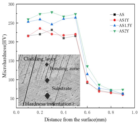 Figure 5 shows the microhardness measurement results and indentation morphologies of the laser cladded sample sections. The curves in Figure 5 show that all the cladded samples have a similar tendency in terms of the microhardness distribution over the coating depth, which is consistent with the variation of the indentation dimension. The test results show that the test indentation steadily increases from the upper surface of the cladding to the substrate, indicating that the cladding surface has the highest hardness. Measurements of the hardness of coatings containing Y2O3 in comparison to the AS cladding layer show a significant improvement. The microhardness of all cladded coatings is higher than that of the substrate, which is about 75 HV, and the average microhardness of the cladding layer of AS2Y coating reaches the highest (about 270 HV), and the average microhardness of the AS cladding layer is only 220 HV. The addition of Y2O3 can refine the grain and introduce more grain boundaries. The grain boundary reinforcement and dislocation strengthening are conducive to the improvement in the coating microhardness. Additionally, the production of intermetallic compounds Mg2Si and Al4MgY has a favorable impact on enhancing the hardness of the laser-clad layer, as evidenced by the examination of microstructure, XRD, and SEM-EDS data [4].