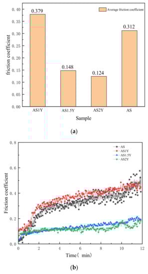 Comparison of the friction coefficient between the unmodified and Y2O3-modified coatings: (a) average friction coefficient, and (b) friction coefficient evolution history.