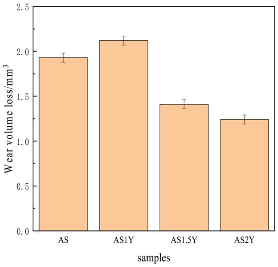 Figure 7 shows the wear volume loss of the cladding layer after 15 min of anti-grinding. The figure clearly shows that the AS2Y cladding layer’s wear volume loss is substantially smaller than that of the AS coating, demonstrating that the addition of Y2O3 can somewhat reduce the coating’s wear loss and increase its wear resistance. In fact, the evolution tendency of the wear volume loss in Figure 7 is consistent with the microhardness results in Figure 5. According to Deng et al. [29,30,38], a higher wear resistance or lower wear volume loss is generally obtained by increasing the mechanical strength and microhardness of a metallic material.