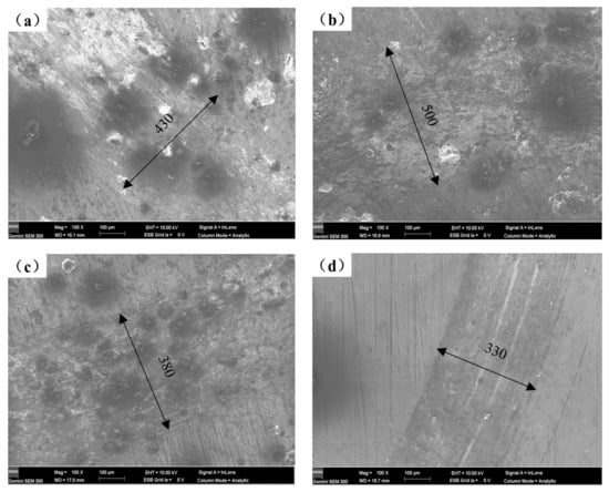 A TMVS-1 Vickers microhardness tester was used to measure the microhardness, with a force of 100 gf (0.98 N) and hold for 10 s during measurement. Each microhardness point was determined by performing five consecutive measurements on the coated cross section at the same depth and averaging the results. The sliding tribological test was performed in dry condition using an MPX-3G pin-disk friction wear tester. The grinding process lasted 15 min with a 50 N experimental load. The wear volume and worn surface morphologies have been analyzed following the previous studies [29,30]. Use epoxy resin to encapsulate the sample to be tested, and use CHI660e electrochemical workstation to test the Tafel polarization curve. The working electrode was the sample, the auxiliary electrode was a platinum sheet, and the reference electrode was a saturated calomel electrode. The electrolyte employed was a 3.5% NaCl solution.