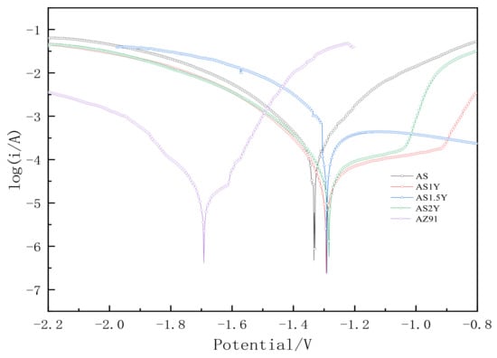 Figure 9 depicts the potentiodynamic polarization curves of the test specimens in a 3.5 weight percent solution of NaCl at room temperature, and Table 4 lists the electrochemical parameters that were obtained from Figure 9. Lower corrosion current values correspond to lower corrosion rates and greater corrosion resistance of the coating in terms of corrosion dynamics [33]. The data in Table 4 shows that the corrosion resistance of the coating created by laser cladding on the AZ91D magnesium alloy substrate is greatly improved compared to the uncoated AZ91D, and with the content of Y2O3 increasing the corrosion current density of the coating generally increases first and then decreases. When the Y2O3 content in the coating reaches 2%, the corrosion potential of AS2Y sample is the highest (−1.284 V), and the corrosion current density reaches the lowest (7.027 × 10−5 A/cm2) among all the samples tested, which indicates the best corrosion resistance. Figure 10 shows the surface corrosion morphologies of AZ91D, AS and AS2Y samples after salt-immersion tests in 3.5 wt.% NaCl solution for 72 h. It can be observed that the corrosion surface of AZ91D in Figure 10a tends to develop vertically accompanied by deep and large corroded pores, which indicates the poor corrosion resistance. In the case of AS sample in Figure 10b, the occurrence of homogeneously uniform features with few pitting corrosion sites is evidenced at the specimen surface. Figure 10c shows no obvious pitting, with some micro-cracking on the surface. Figure 10d corrosion surface smooth without cracks produced, a very small part of the surface shows micro-pitting. In contrast, the surface of AS2Y sample in Figure 10e presents quite flat characteristics without pitting corrosion sites, indicating a superior corrosion resistance. Thus, adding Y2O3 to coatings is a viable technique to improve the corrosion behavior of AZ91D magnesium alloy, much like adding calcium to AZ31 magnesium alloy [41].