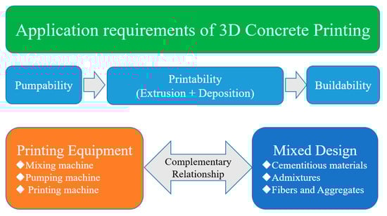 A 3DCP equipment should be designed to meet the essential criteria directly related to the final objective of printing concrete structures using a concrete mixture. Therefore, determining the complementary relationship between the mix design of the materials and the printing equipment is necessary. As depicted in Figure 1, the basic approach to 3DCP technology development is to design/manufacture printing equipment and design 3DCP mixtures that satisfy the main factors of pumping, printing, and building performance required for printing structures.
