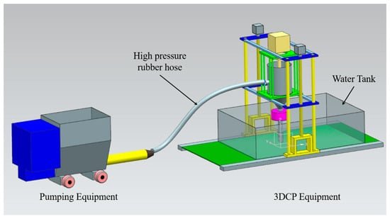 (1) Pumping device and mixture transfer tube: the pumping device depends on the characteristics of the mixtures (slump: 4–8 mm and slump flow: 150–190 mm) used in a typical mortar-based construction 3DCP and prints a building structure with a certain layer width (<30 mm) and height (<15 mm) [23]. In this study, the mixture chosen for printing concrete structures in water using the 3DCP equipment presented high viscosity and low fluidity. For WP, a high-power motor and a high-performance progressive pump were needed to transfer the high-viscosity and low-fluidity mixture to the 3DCP equipment.