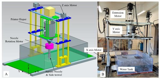 The printing equipment of 3DCP system: (A) concept model; (B) developed machine.