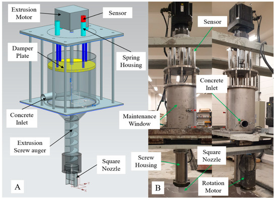 The extrusion module of 3DCP equipment: (A) concept model; (B) developed device.