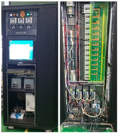 The printer system control module shown in Figure 7 is divided into equipment operation and control units. The equipment operation part automatically controls the printer equipment by the HMI of the PC and manually controls the pumping equipment. The equipment control unit comprises a CPU and PLC module, motor drive, communication module, power module, and circuit breaker for controlling the printer and pumping equipment.