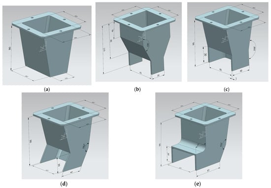 Types and details of nozzle (The unit of length is mm): (a) Nozzle#1; (b) Nozzle#2; (c) Nozzle#3; (d) Nozzle#4; (e) Nozzle#5.