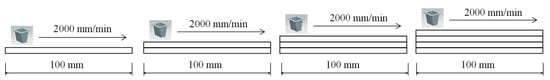 Straight-line printing tests of the five types of nozzles were conducted in air and underwater. After completing the air printing (AP) on a plywood installed on a water tank, as shown in Figure 2, the plywood was removed, and WP was conducted in the water tank. A part was printed in a linear shape with a length of 1 m, and all layers were printed in the same direction to maintain the same time difference between the layers (Figure 10). The nozzle movement speed was fixed as 2000 mm/min. Therefore, the printing time gap between the layers was approximately 68 s. The printing height of each layer was set as 30 mm, and four layers were deposited. When each of the five straight-line printing tests were performed underwater, the measured water temperature in the water tank was in the range of 17.2 to 24.8 degrees. In this study, it was regarded the water temperature difference in that range has little effect on the deformation of the printed part. The effect of water temperature on the deformation of the printed part has not been studied yet, and the research will be conducted in the future.