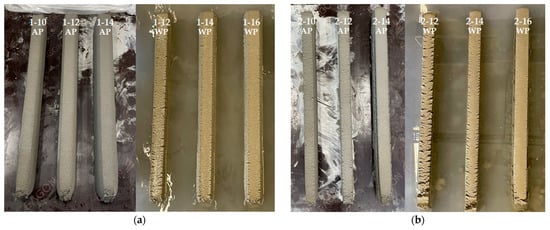 A specimen was manufactured to measure the density and compressive strength by coring the deposited parts prior to hardening. As shown in Figure 12, a cylindrical coated paper mold with a diameter of 50 mm and a height of 100 mm, with both open top and bottom surfaces was vertically inserted into the deposited parts at approximately 30 min. After the deposited parts were made, and the remaining samples outside the mold were removed to separate the six specimens. Specimens manufactured in air were cured in air for 2 days with plastic sheets covered, and after demolding, they were placed in curing water. In the case of specimens manufactured underwater, after separating the specimens from the deposited parts, they were transferred to a curing water tank, which was removed after two days, demolded, and cured in water again.