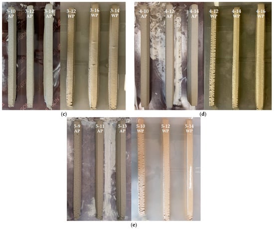 Figure 13 shows the results of the straight-line printing. In the deposited part, the first digit of the name is the nozzle number, the second digit is the HSRS, and the last digit denotes AP or WP. For example, 1–12 WP deposited part is a test specimen printed in water at an HSRS of 12 rpm using Nozzle#1. Table 4 qualitatively scores print quality. The scores for each surface defect, deformation degree, and dimensional consistency are subjectively marked from 1 (good quality) to 5 (bad quality), and the average of the three scores is calculated as the overall score.