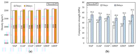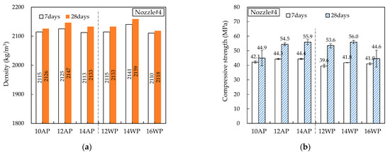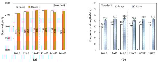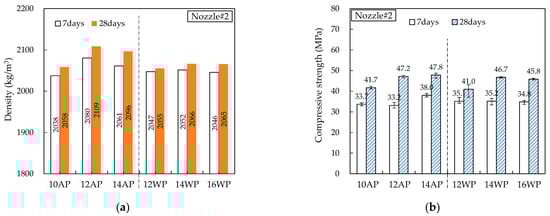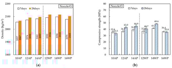Figure 14, Figure 15, Figure 16, Figure 17 and Figure 18 show the density and compressive strength results of all specimens measured at 7 and 28 d of age. Overall, the density and compressive strength trends were similar. In addition, a good print quality implies a high density and compressive strength. Therefore, if material and equipment system conditions that can satisfy good print quality are derived, the hardened properties will also be satisfactory.