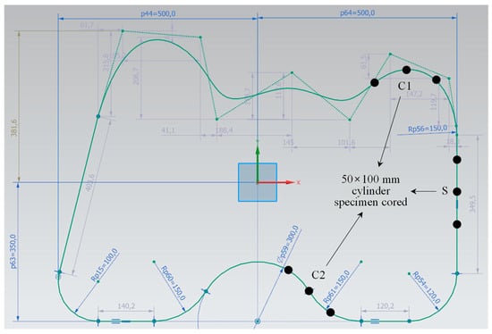After completing the curved WP, three φ50 × 100 mm cylindrical specimens were extracted from positions C1, C2, and S, which are shown in Figure 19. Similar to the straight-line printing tests, the specimens were manufactured by coring a coated paper mold vertically into the deposited part, and the hardened properties on 28 days of age after curing in water were measured. Figure 21 shows the results for density and compressive strength. Similar to the print quality results, the density and compressive strength of the curved parts (C1 and C2) were lower than those of the straight part (S). This also is owing to the non-uniform material discharge caused by the nozzle rotation in the curved part. The nozzle with fixed trowels used in this study has limitations in solving this problem. As suggested by Khoshnevis [25], a trowel can be deflected at different angles (by computer control). Using the printed material can improve the output quality of the curved parts and create various non-orthogonal structures with smooth and accurate surfaces. Furthermore, printing materials that can prevent the reduction in cohesion in the concrete matrix during WP should be developed.