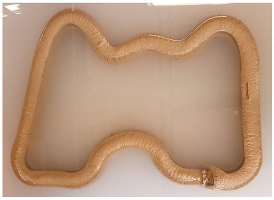 In a general mortar-based 3DCP for construction, a high-pressure rubber hose (diameter: <25 mm) is used as the material transfer pipe. In this study, the mixture used for WP exhibited high viscosity and low fluidity. Moreover, material separation should be avoided when transferring the mixture at a high pressure. Therefore, a high-pressure rubber hose (diameter: 50–60 mm) was also used as the material transport pipe connected to the printing device, and it was flexible.