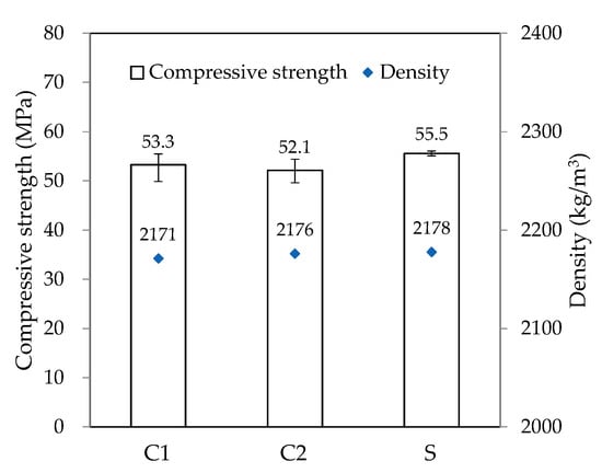 The densities of the six cylindrical specimens at 7 and 28 d of age for each deposited part were measured according to EN 12390-7 [34]. The mass used for the density calculation was measured with a scale in a dry surface condition in air, and the volume was obtained by actual measurements. The compressive strengths of the cylindrical specimens used for the density measurements at 7 and 28 d of age were measured according to ASTM C39 [35]. The compressive strength test was performed using a 5 MN compression tester, and a load was applied at a rate of 0.25 MPa/s.