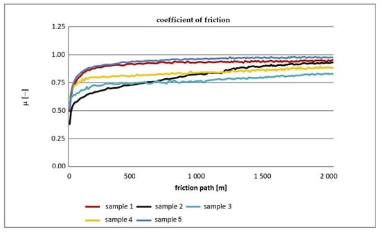 During the tribological tests, it was found that the friction coefficients increased for all tested materials in the initial phase of the research. After about 11,000 cycles, the values of friction coefficients stabilized. The highest value of the coefficient of friction was observed for sample No. 5—0.975. The lowest coefficient of friction was observed for sample No. 3—0.769 (difference 126.78%).
