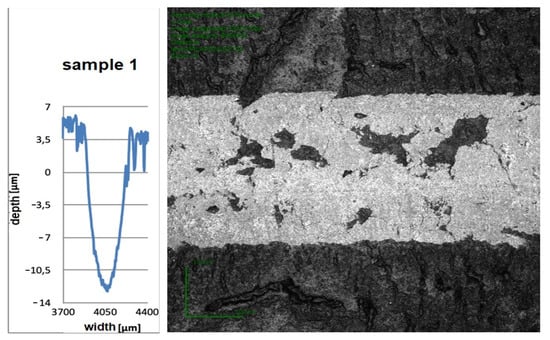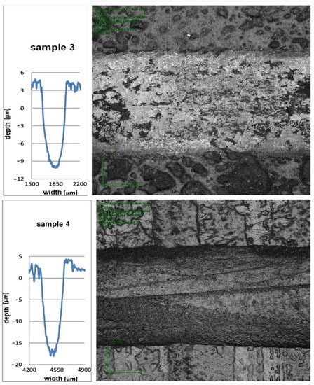 After the wear test, microscopic examinations of the tested samples were carried out. During these tests, the penetration depth and the wear path width were determined. Then, a cross-sectional profile of the friction zone was plotted. Figure 7 shows the three most characteristic microscopic results with the corresponding cross-sectional profile.