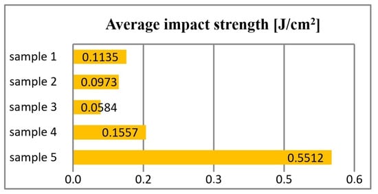 As a result of the impact tests, it was found that sample no. 5 had the highest fracture resistance of 0.5512 [J/cm2]. Sample no. 3 was characterized as the lowest impact strength, equal to 0.0584 [J/cm2].