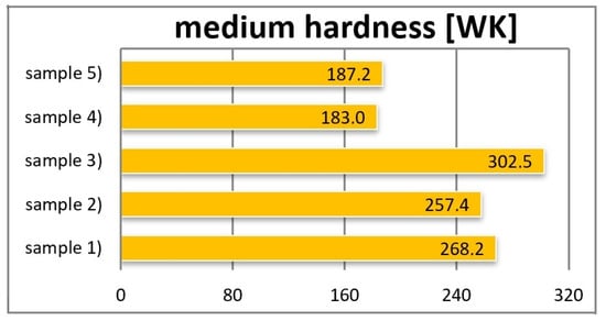 During the hardness tests, the ball indentation method was used. The highest hardness tested by the ball indentation method, amounting to 302.5 [N/mm2], was found in sample no. 3, and the lowest, equal to 183 [N/mm2], was observed in model no. 4.