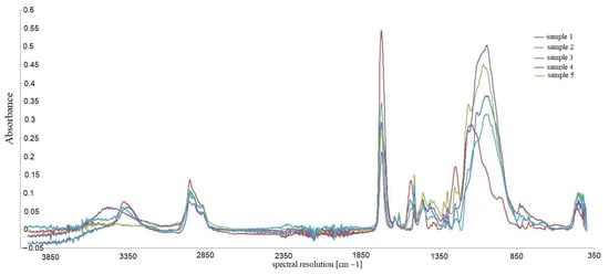 All analyzed spectra have an evident, narrow, high band with a frequency of 1715–1725 cm−1. It comes from stretching vibrations of the carbonyl group of tested molecules. In addition, the presence of bands of similar intensity at a length of 1030–1050 cm−1 derived from -CO stretching vibrations indicates bands of equal power at a distance of 1030–1050 cm−1 derived from -CO testing trying beats, indicating the presence of ester bonds in the molecules; they are especially numerous in samples 3 and 5. For the remaining samples, the peak height ratio suggests significant differences in the number of both atom connections. In sample 4, the -CO bonds dominate, which may indicate ether connections [,].