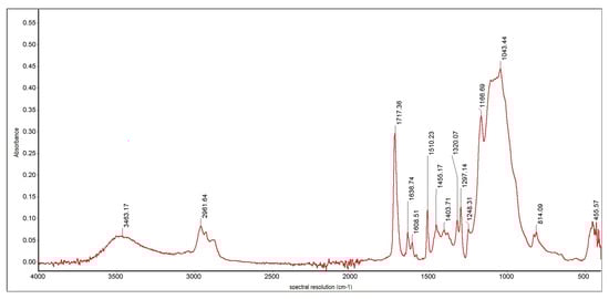 Identification of the substance, its impurities, the types of bonds and functional groups, and the study of substituent effects in the molecules of the tested compounds were performed using infrared spectroscopy. The FTIR Nicolet 8700 A spectrometer by Thermo Scientific (year of production 2009) was used in the tests. The spectra were recorded by the ATR (Attenuated Total Reflection) method directly from the surface of the samples. IR spectra were recorded in the wavenumber range from 4000 to 400 cm−1, with a spectral resolution of 4 cm−1. The obtained spectra were subjected to baseline correction operations using the Omnic Specta ™ software for interpretation purposes. Figure 10 shows the cumulative results of the chemical analysis of the tested samples. Figure 11 and Figure 12 show an exemplary IR spectrum for selected samples to more accurately visualize the analysis results of a single material [,,].