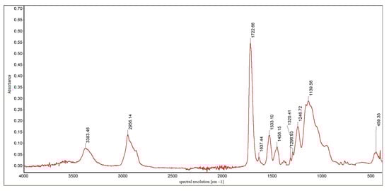 The IR spectrum is a graph of the dependence of the absorption of infrared radiation on the frequency of vibrations caused by it in individual structural elements of molecules. It consists of bands (peaks) representing the deformation of the baseline in the form of mountains with a pattern characteristic of a given compound []. The spectra analysis is carried out by assigning the type of vibrations occurring in the molecules to the individual bands recorded on the spectrum; it allows for comparing the structures of organic components of the tested preparations. Thanks to the ATR technique, it is also possible to compare the content of individual chemical groups present in the molecules of the components of the tested preparations by determining the ratio of the height of individual unique peaks. The frequencies at which they reached their maximum are given for the most distinct bands in the spectrum [,,,].