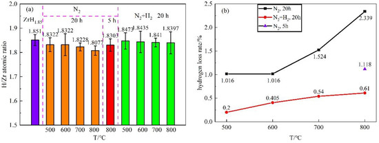 H/Zr atomic ratio and hydrogen loss rate of zirconium hydride matrix when film prepared in N2 and N2 + H2 atmosphere (a) H/Zr atomic ratio; (b) hydrogen loss rate.