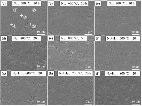 Surface SEM images of zirconium hydride with nitride film (a) N2, 20 h, 500 °C; (b) N2, 20 h, 600 °C; (c) N2, 20 h, 700 °C; (d) N2, 20 h, 800 °C; (e) N2, 5 h, 800 °C; (f) N2 + H2, 20 h, 500 °C; (g) N2 + H2, 20 h, 600 °C; (h) N2 + H2, 20 h, 700 °C; (i) N2 + H2, 20 h, 800 °C.