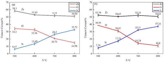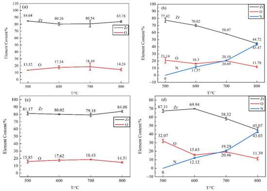 As shown in Figure 5, the films prepared in both N2 and N2 + H2 atmospheres at 500 °C were composed of Zr and O without the detection of N, mainly due to the thin film. The detected oxygen may be attributed to residual oxygen in the atmosphere. At 600 °C and above, nitrogen was detected in the films, and its content increased with the increase in temperature. At 800 °C, the main elements of the film were Zr and N, followed by element O, indicating the film was composed of a major component of zirconium nitride and a small amount of zirconia. The elemental composition and their changing trends of the films in cross-sections with the temperatures were consistent with that of the surface, indicating little change of elemental contents in the matrix.