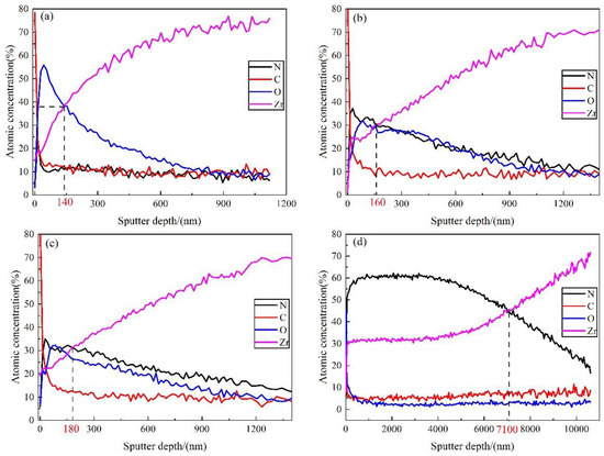 AES method was applied to analyze the composition distribution of nitride film formed in N2 + H2 atmosphere at 500 °C, 600 °C, 700 °C and 800 °C for 20 h, and the results are shown in Figure 6. It could be seen that the major elements in the film were Zr and O at 500 °C, Zr, N, O at 600 °C and 700 °C, and Zr, N at 800 °C. These results indicated that the residual oxygen in the atmosphere would form an extremely thin zirconia film on zirconium hydride at 500 °C, showing a certain hydrogen permeation resistance effect. Zirconium hydride could react with nitrogen at 600 °C and 700 °C to generate zirconium nitride film. The film growth was significant, with a fast N diffusion rate at 800 °C, which was consistent with the SEM and EDS results. The intersection of Zr content line and N (or O) content line was used to determine the film thickness [52]. It can be seen that the film thickness was 140 nm, 160 nm, 180 nm, and 7100 nm at 500 °C, 600 °C, 700 °C, and 800 °C, respectively. Therefore, no obvious film was observed by SEM due to the thin film formed at 500~700 °C, ellipsometer method may provide a solution for its measurement precisely.