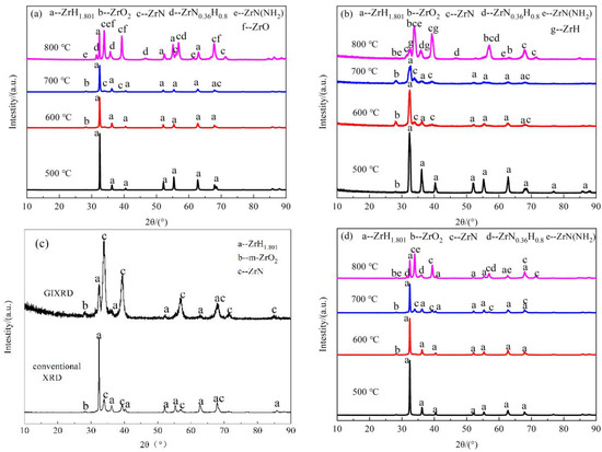 The phase of conventional XRD was ZrH1.801 in pure N2 atmosphere, which was still the matrix phase. However, the m-ZrO2 phase was detected by grazing incidence XRD (GIXRD) at 500 °C, indicating that the oxide film was too thin to be detected by conventional XRD due to the low temperature. The temperature of the oxidation reaction was lower than that of the nitridation reaction with zirconium hydride. Compared with the characteristic peak at 500 °C, m-ZrO2 and ZrN phases appeared in the patterns of conventional XRD and GIXRD at 600 °C. The surface phase characteristics at 700 °C were similar to those at 600 °C, except that ZrN was detected by conventional XRD, indicating an enhanced surface nitridation reaction at a higher temperature. At 800 °C, the phases of conventional XRD of the film included ZrH1.801, ZrN, ZrO, ZrN(NH2), and ZrN0.36H0.8; ZrH and ZrO2 were detected by GIXRD without ZrH1.801 and ZrO, and the main peak changes to ZrN both by conventional XRD and GIXRD. These results indicated that the ZrN-based film was generated on zirconium hydride, and the matrix did not undergo the dehydrogenation phase transition. That is, the film with ZrN as the major phase exhibited excellent hydrogen permeation resistance.