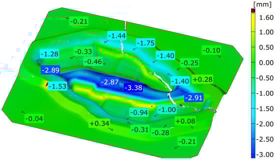 - The geometry of the tool surface also has a significant impact on the formation of fatigue cracks—the dislocation effect. Based on the 3D scanning, a large loss of material occurs in the middle part between the blanks and is locally even above 3 mm. This wear is the result of intensive flow of the charge material in these areas.