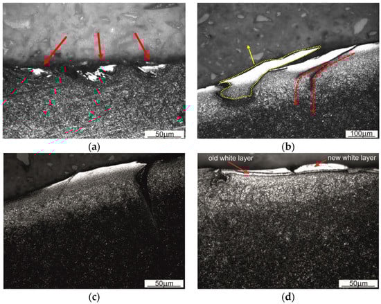The white layer, characterized by very high hardness and brittleness, is composed of martensite formed as a result of cooling the heavily damaged austenite. As a microstructure with the highest specific volume, martensite increases the level of stresses between the surface layer and the base material, thus facilitating the development of cracks. Therefore, the formation of a white layer on the surface of the tool explains the formation of cracks, shown earlier in Figure 6b,c. Particularly, Figure 6b shows very clearly the path of the cracks, which at the beginning are running parallel to the layer but later start propagating deeper into the material (the crack path is indicated in the drawings with dashed red arrows). Figure 6c shows the exposed layer of material caused by further development of the crack along the white layer that has broken off during prolonged operation of the tool, allowing for the formation of a new layer and continuation of the die surface’s degradation process. A similar mechanism of the defect formation operates in the part of the white layer marked with a yellow dotted line in Figure 6b.