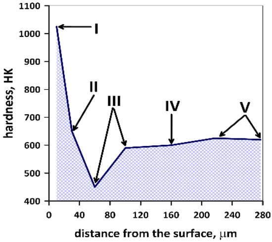The white layer, apart from being a difficult-to-etch phase, is also characterized by a very high hardness (>1000 HV). Its formation is due to a rapid increase in the temperature of the surface layer to the range of the austenite formation, followed by equally rapid cooling and the resulting martensitic transformation. This process is accompanied by severe deformation of the crystal structure. To confirm the existence of a white layer on the tool’s surface, hardness measurements were made in area 4a (Figure 3), using, for this purpose, a Struers Duramin 40 M1 hardness tester. Hardness was measured by the Knoop method, which enabled measuring changes in this parameter at a small distance from the surface of the die insert. Several measurements were taken. From the analysis of the measurement results (Figure 7), it can be concluded that as a result of tribological wear of the die insert at high operating temperatures of the tool, a white layer was formed on the surface of this tool. The occurrence of the white layer in the top layer was additionally confirmed by the fact that in the examined area of the top layer, the temperature of the tool was higher than the temperature of the austenite formation (840 ÷ 875 °C).