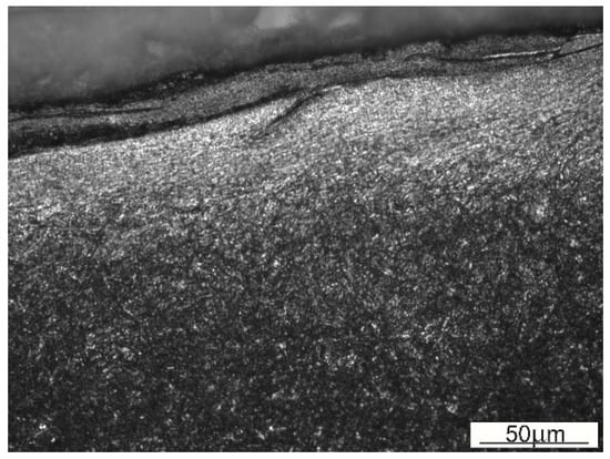 Sticking of material is the phenomenon commonly coexisting with the formation of a white layer on the surfaces of hot forming tools. An interaction between these phenomena is possible mainly due to the formation of an easy adhesive bond between the austenitized layer resting on the tool and austenite present in the wrought material []. The examination of the subsurface layer in a fragment of the flash web in a sample, and more precisely, on the fillet radius at the die cavity’s transition into a web, indicates sticking of the forged material to the die surface (Figure 8). This is the result of the occurrence of adhesive wear with its characteristic feature, which is the formation of a permanent bond between the tool’s surface and the forged material during plastic flow of this material over the die wall. The adhesive bond is stronger than the cohesive bond formed with the forged material. With further flow of the material, the decohesion, or the detachment of some fragments of the forged stock, occurs, and the detached fragments are next transferred to the surface of the die insert. Figure 8 shows how clear the difference is between the sticking material and the top layer of the die insert.
