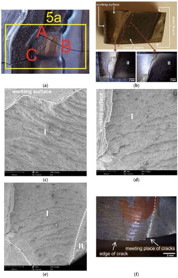 In the central part of the tool, the die insert has a crosswise running crack, which is a continuation of the crack that occurs in the remaining parts of the tool. The fragment of the tool shown in Figure 9a (Figure 3—area 5a) covers the area of the two die cavities, an inner web separating these cavities, and an outer web. It is worth noting that in this place, the crack (Figure 1), whose direction was so far parallel to the side walls of the die cavity, has changed its plane to perpendicular. This may be due to the fact that the examined fragment is located in the central part of the die cavity, exposed to the effect of the most critical loads in the initial stage of the forging process. This area is particularly vulnerable to wear, as the flowing material is confined on several sides by the walls of the die, with the result that, locally, there is an increase in stresses, and the resultant direction of the stresses leads to loosening of the tool fixing. Figure 9a shows macro pictures of the examined areas. Due to the crack from area A, the area shown in Figure 9b was analysed by scanning electron microscopy. This fragment represents the corner of the impression die that broke during operation. A spall of material from the working surface can be observed on a section of the die (I). This spall then transitions into a localised coarsening of the tool to again transition into a slightly smaller spall. This part is an area of delamination resulting from thermal fatigue. Another area, marked II, is the result of fatigue at the point of change in the shape of the die, which has fractured along one plane almost across the entire tool. Figure 9c,d shows the transition between the working surface and the fatigue–thermal delamination. The fatigue striations are arranged perpendicular to the chipping edge. In contrast, the transition between thermal fatigue delamination and fatigue crack II can be observed in Figure 9e.
