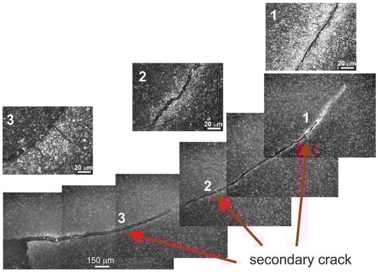 The view of the secondary crack in area C from Figure 5a. 1, 2, 3 indicate the areas that were have been enlarged for better legibility.