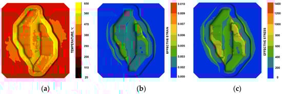 The forging process analyzed involves the intensive movement of charge material under high unit pressure. Friction on the tool surface is a natural cause of wear. The layer of lubricant at high unit pressures can break, exposing the surface of the charge covered with hard particles that increase tool wear. The obtained results of the numerical modelling of the die insert are presented in Figure 11. Figure 11a shows the temperature distribution on the tool surface. The maximum temperature reached during pre-forging is about 650 °C at the outer bridge. The bridge separating two die cavities is in contact with the heated material from the very beginning of the process, as a result of which it reaches high temperatures. The highest values are reached near the smaller corners of the die cavity, on the outer side. The lowest values are observed on the outer side of the die cavity bridge. This is due to the material flow inside the die cavity strongly affecting the tool. Taking into account the distributions of effective strain and effective stress, it is possible to observe the highest values in the corner at the area of die cavity–outer flash groove. Comparison of the results of numerical modelling with the results of 3D scanning confirms the high wear of the insert in the area of the inner flash and at the transition of the die cavity into the flash groove.