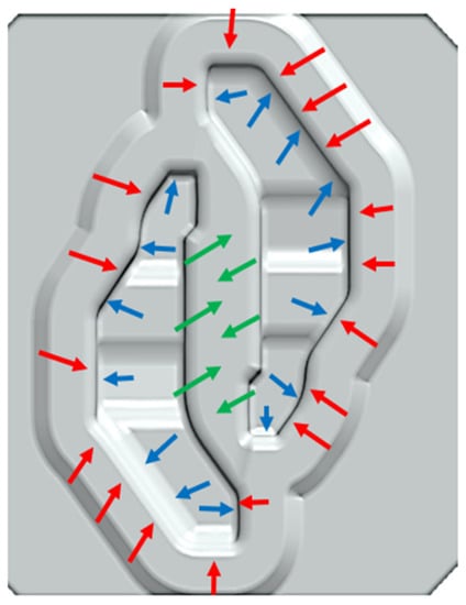 Figure 12. The areas of the dominant wear mechanisms on the surface of the forging tool: erosive tribological (green arrow), fatigue cracking (blue arrow), and white layer formation (red arrow).