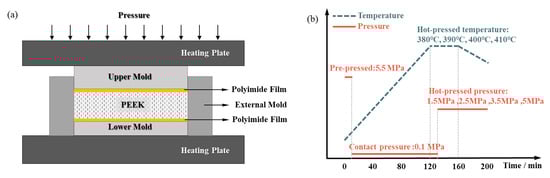 The PEEK used in this experiment is 550PF PEEK powder (Jilin Joinature Polymer Co., Changchun, China), the density is 1.3 g/cm3, the melting point is 343 °C, the glass transition temperature is 143 °C, and the grain size is 50 μm to 75 μm. This PEEK raw material has been widely applied in engineering applications and has been proven to have outstanding mechanical properties, anti-corrosion characteristics, and flame retardancy [34]. Polyimide film (Shenzhen Changdasheng Electronics Co., Shenzhen, China) is a non-adhesive high-temperature resistant film with a thickness of 0.125 mm and temperature resistance of −50 °C to 500 °C. The hot-pressed mold is made of high-performance steel (H13), which has outstanding overall performance at 600 °C and a low heat treatment deformation rate, suitable for use as mold material for PEEK. The vacuum drying oven is DZF-6050 (Shanghai Yiheng Technology Co., Shanghai, China). The hot-pressing machine is Carver hot press (Carver 4129, Carver Inc., Philadelphia, PA, USA), which is shown in Figure 1a. In the manufacturing process, the heat is transferred to the PEEK raw material layer through a removable mold to achieve the target temperature. The polyimide film between PEEK raw material and mold can avoid the adhesion problem between PEEK and mold during the un-molding process.