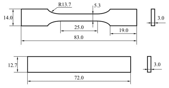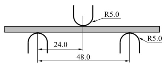 The tensile properties and bending properties of PEEK specimens were tested by a material testing system (MTS 810, USA). The test standards of ASTM D638 and ASTM D790-3 were employed to obtain the tensile and bending properties of the PEEK plate, respectively. The geometry and size of specimens are shown in Figure 2. The bending test setting and the shape of the bending specimen are shown in Figure 3, the radii of the two specimen supports and the loading indenter are 5 mm, and the distance between supports is 16 times the thickness of the specimen. The crosshead is loaded by controlling the displacement of the crosshead, and the speed of the crosshead in both tests is 2 mm/min to simulate a quasi-static loading condition. Five repeating experiments were conducted for each experiment.
