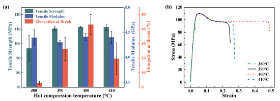 The effects of different hot compression temperatures on the tensile modulus and strength of PEEK are shown in Figure 4. It can be seen from the figures that with the increase in the hot compression temperature, the tensile strength first increases and then converges to a stable level of 110 MPa. The elongation at break also showed an increasing trend at first and then decreased. However, the tensile modulus was less affected by the hot compression temperature, and the modulus was between 4.3 and 4.4 GPa. When the temperature does not exceed 400 °C, the tensile strength of PEEK gradually increases and tends to stabilize after the hot compression temperature reaches 400 °C. Compared with the samples processed at 380 °C, the yield strength of the sample processed at 400 °C increased by 15.2%. The sample processed at 380 °C exhibits a brittle fracture, and the elongation at break is relatively small compared to that of the other samples. When the samples are processed over 390 °C, the samples will exhibit plastic fractures. In particular, when the processing temperature is over 400 °C, the yielding strength of the material can be increased by 15 MPa, and the average elongation at break reaches 43.1%, which is significantly higher than the value of 26.2% for the samples processed at 390 °C. Therefore, it can be seen that the hot compression temperature has a significant influence on the tensile properties of PEEK-molded samples. At 400 °C, PEEK has the most outstanding comprehensive performance.