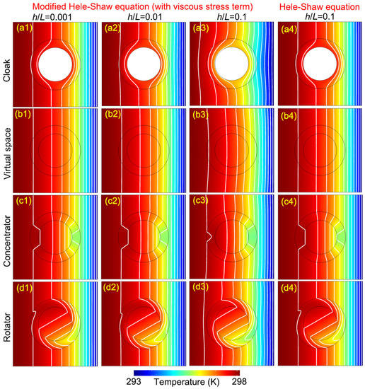 in the first two columns is 0.001 and 0.01, and the corresponding pressure difference is 50 Pa and 0.5 Pa, respectively. The flows can be approximated as Hele–Shaw flows. Comparing the contour plots and isotherms of three devices and the virtual space, we find that the cloaking, concentrating and rotating functions inside the devices are all realized. In addition, the three devices are also indeed invisible to the background. Of course, if we observe carefully, we will find that the isotherm in