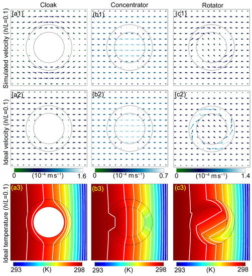 3b)]. The ideal distributions themselves demonstrate rigorous hydrodynamic cloaking, concentrating and rotating, while the simulated distributions are significantly different from the former. It is worth noting that there are distinct boundary layers in all subplots. When