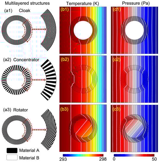 Figure 4(b1,c1). The applied thermal bias, pressure difference and geometric sizes are the same as in the previous simulations. We can see the solid obstacle fails to produce a significant change in the isotherms and isobars in the background region, so this multilayered cloak does work.