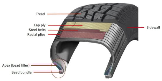 The role of the tire is to ensure immediate contact with the road. It has to carry the vehicle load and provide torque transmission and steering response to ensure satisfactory driving performance. The bead serves to lock the tire to the rim and helps to minimize the risk of rim slip, i.e., circumferential tire slip on the rim, due to occasions of high drivetrain torque. The bead (Figure 1) is produced by spiral winding of brass-coated or sometimes bronze-coated steel wire, which is previously coated with a compound called “bead insulation”, to form a hoop of the specific dimension of the tire. The apex is the component above the bead, filling the space between the inside ply and the ply turn-up. It is usually a hard compound, which contributes to the bead stability but also helps to provide a modulus gradient up the sidewall, preventing stresses from developing towards the high flexural zone at the center of the sidewall [1,30].