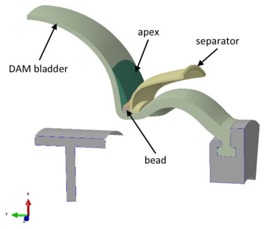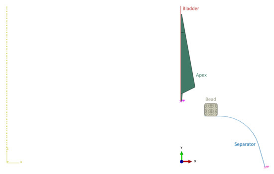 The bladder and separator are modeled as analytical rigid. This is because it is not necessary to determine stress and strain values in these parts of the model, and they are much stiffer than the parts relevant to the analysis. Therefore, no material properties are assigned to them and there is no need to mesh them either, which saves computational time and memory. The bladder geometry is simplified for this simulation task. The real bladder is a membrane that inflates and pushes the apex onto the separator and the bead (see Figure 3). The bladder moves the apex to the separator. When the apex touches the bead of the tire, the apex loses contact with the bladder and strikes the separator. In the real manufacturing process, the separator is plastic, but since the apex is made of rubber with a stiffness much less than the stiffness of the separator, it can be modeled as rigid. It reduces the complexity of FE model building and also the simulation time.