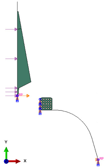 The next step was to define the boundary conditions and loads. In the apexing step, the bladder moves the apex in the x-axis direction by 17.2 mm while rotating about the z-axis by 1.6 radians (91.673°). These movements were defined as forced displacements. While the displacement U1 increases linearly with time from the beginning of the step, the rotation UR3 of the bladder is zero within 0.3 s. Therefore, the amplitude of this rotation had to be entered in tabular form (see Table 4). The remaining degrees of freedom, U2 and UR2, were removed. Since the bladder is an analytical rigid body, the above boundary conditions were defined at its reference point. The bead can only move in the x-axis direction due to the apex mounting on the separator (apexing step). Thus, displacement U2 in the y-axes’ direction and rotations UR2 and UR3 about y- and z-axes, respectively, were set to zero. The separator is fixed, so all degrees of freedom are removed at its reference point. Since the apex moves freely in both computational steps, it was necessary to activate the automatic stabilization of the model. In the pressing step, a normal pressure with 0.01 MPa amplitude is applied to the apex to press it onto the bead and separator. For the present analysis, the state after apex unloading is crucial. Therefore, the time dependence of the pressure amplitude was also defined in tabular form (see Table 4). The definition of the boundary conditions and loads is shown in Figure 6.